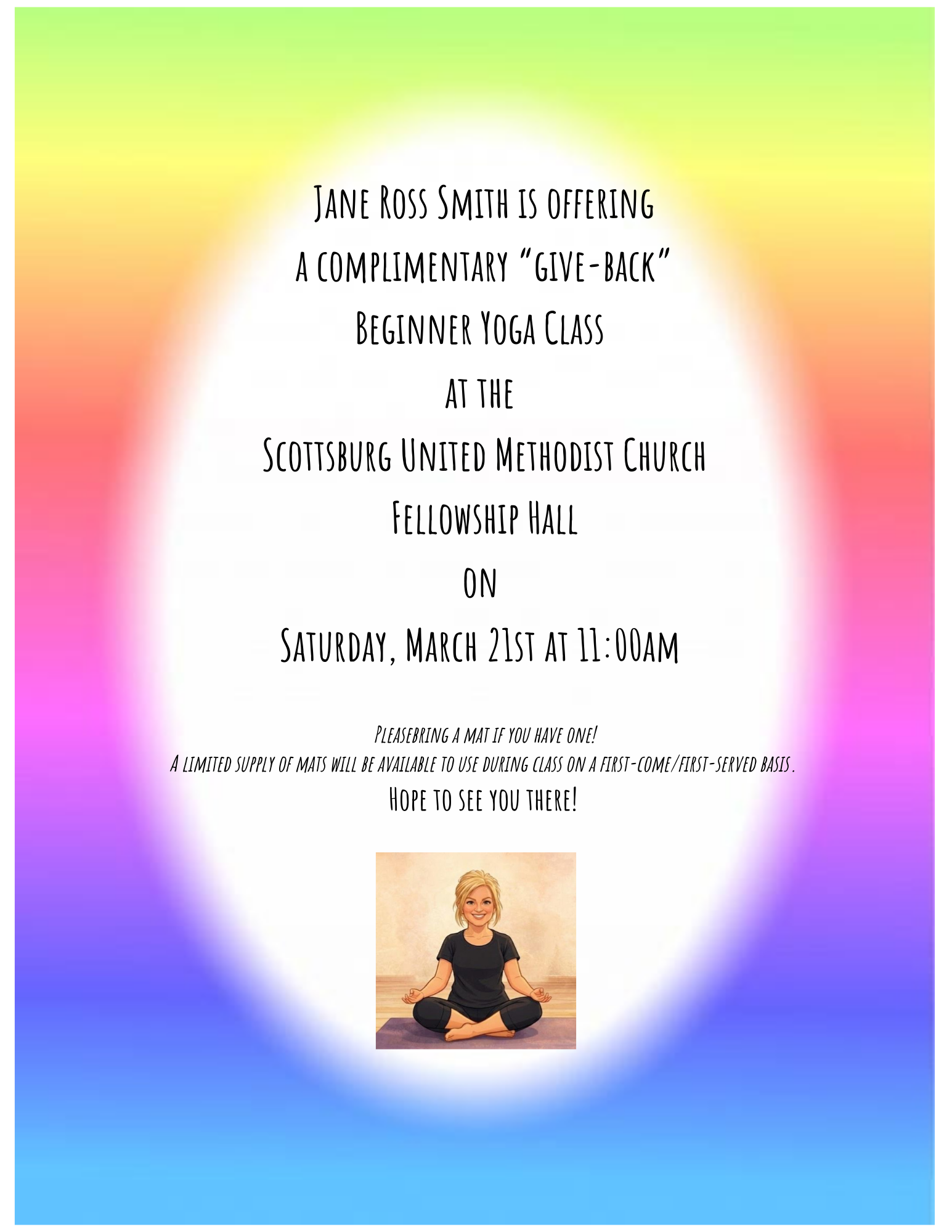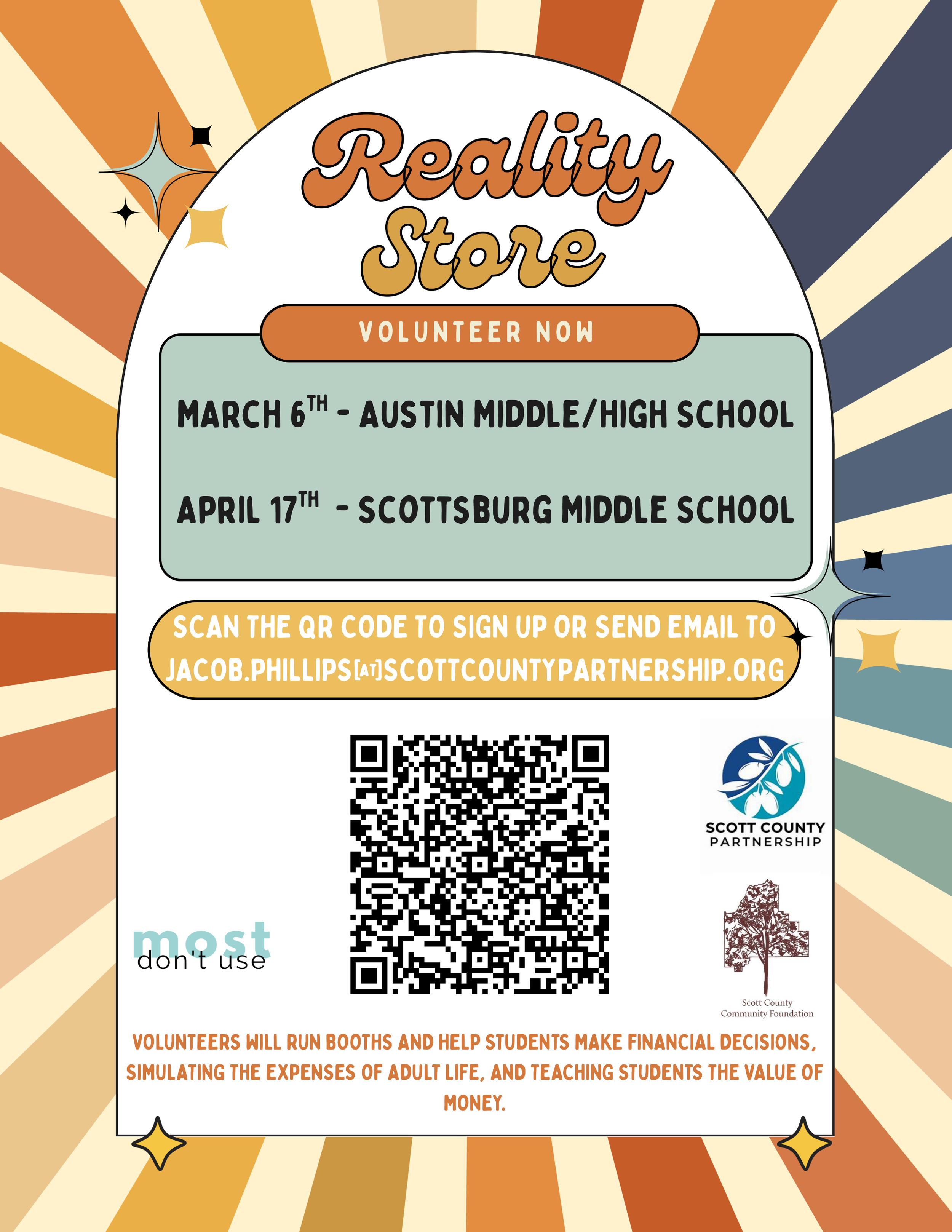 Colorful sign with the word 'SCAN BELOW' and arrows pointing to a QR code. Text at the bottom reads 'Scan to sign up for our e-newsletter'.